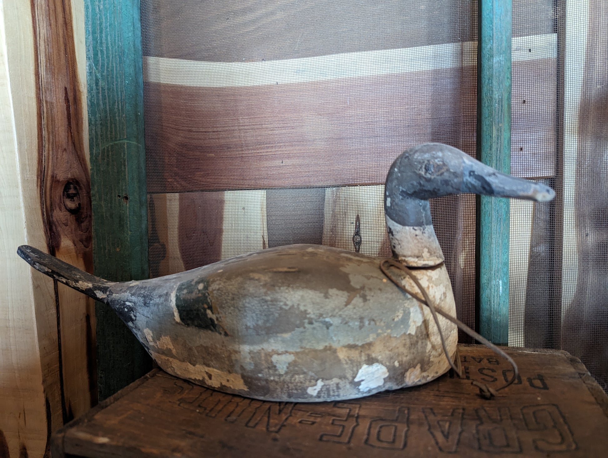 Antique Pintail Decoy has original paint with tack eyes. Balsa wood. Beak to tail 17 inches. Width 5 inches.