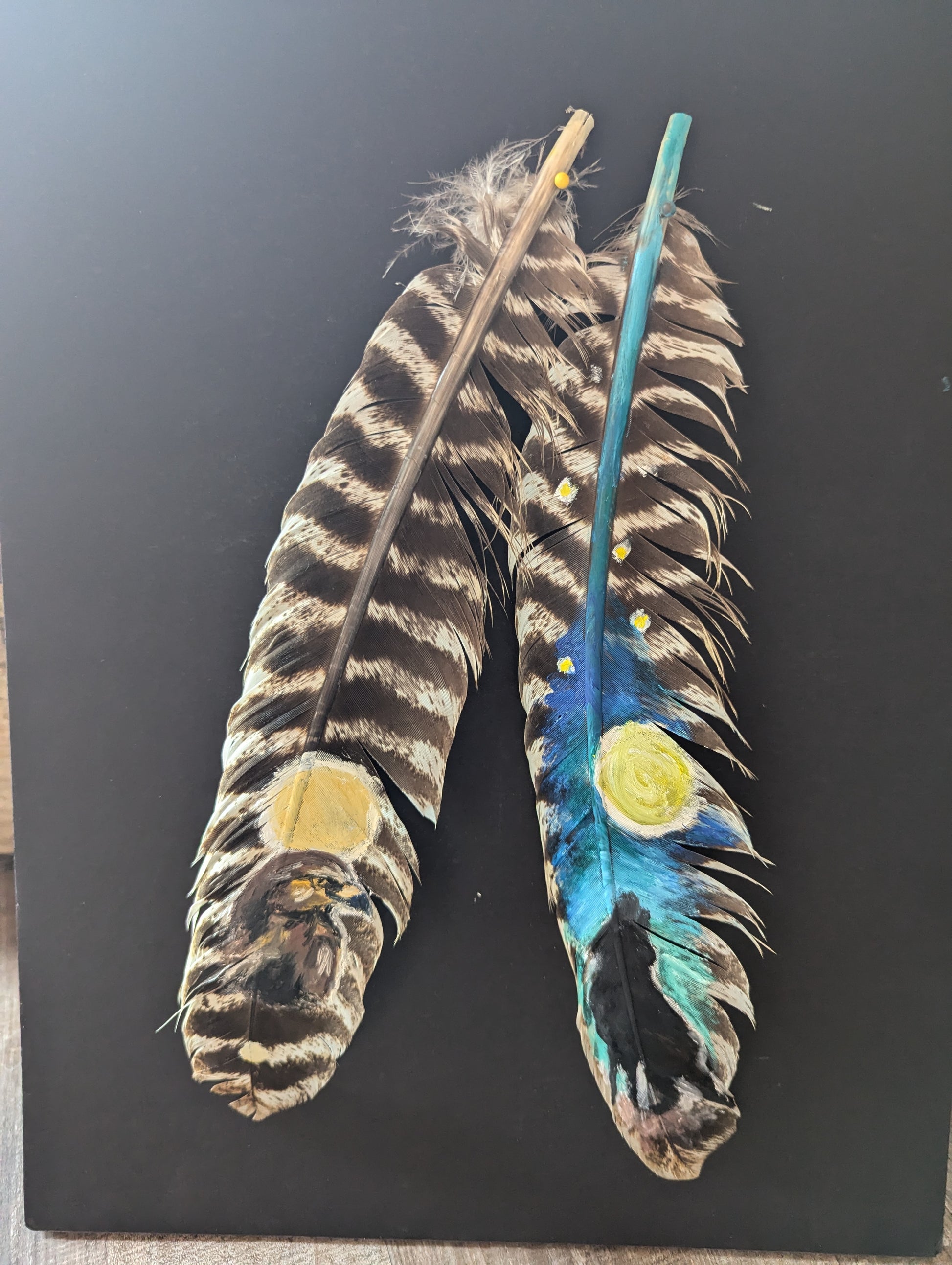 Eagle and Wolf are an oil painting on Turkey Feathers. Painted by Wildlife Artist Savannah Mount.