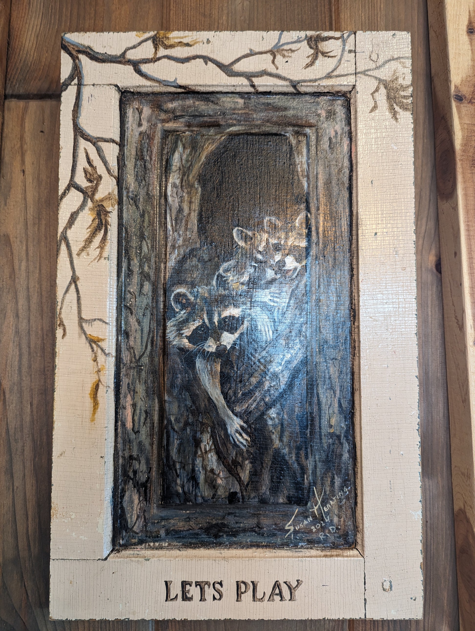Racoons painted on old cabinet door titled Let's Play - medium oil on cabinet door. Painted by Wildlife Artist Susan Hearting. Measures 12.75 x 20.5.