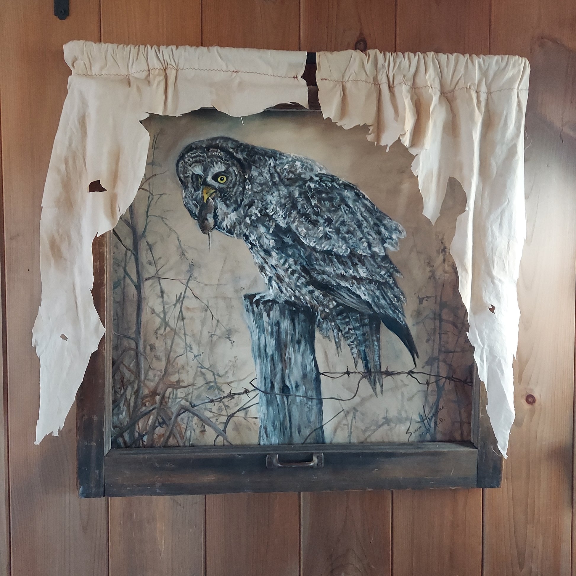 Great gray owl painting. Oil on canvas attached to an old window frame. Painted by Rustic Duck wildlife artist Susan Hearting.