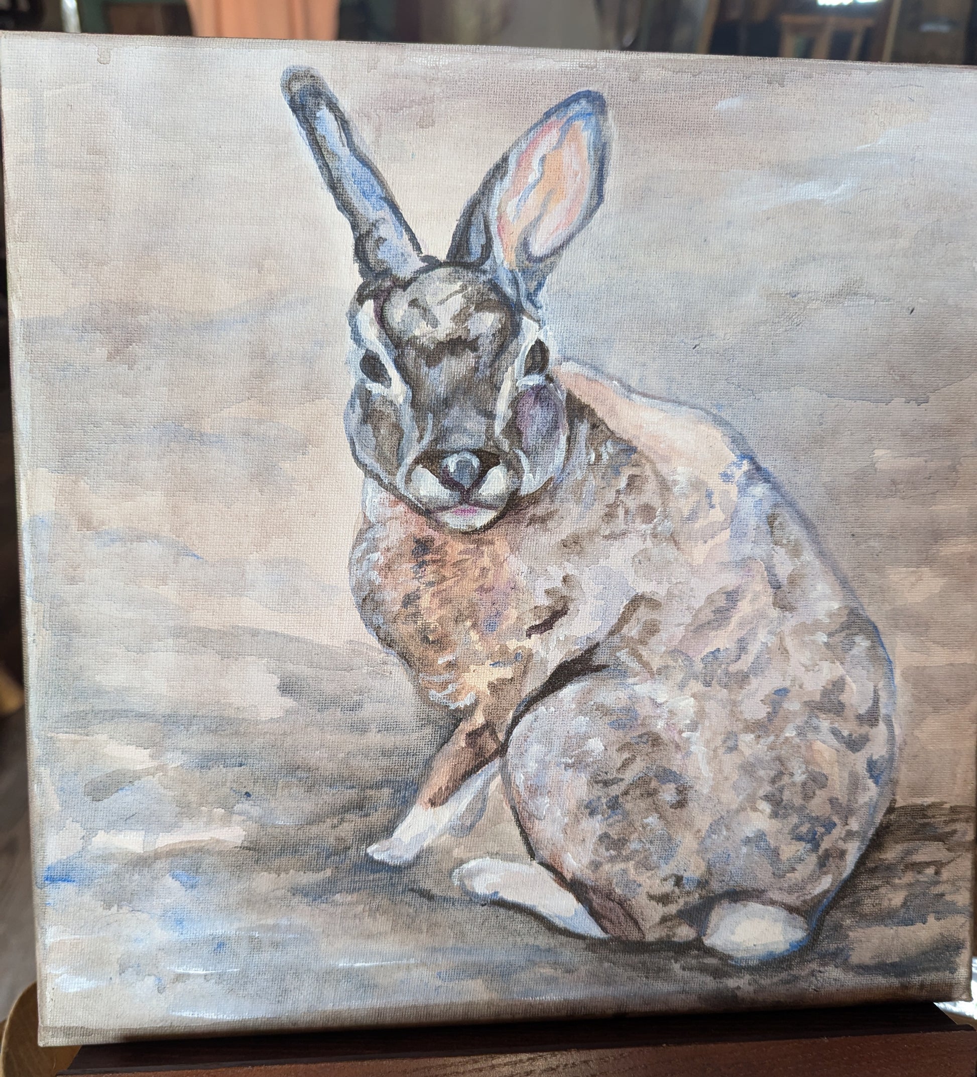 Listening Rabbit is an acrylic on canvas. Painted by Wildlife Artist Savannah Mount. Painting size is 12 x 12.