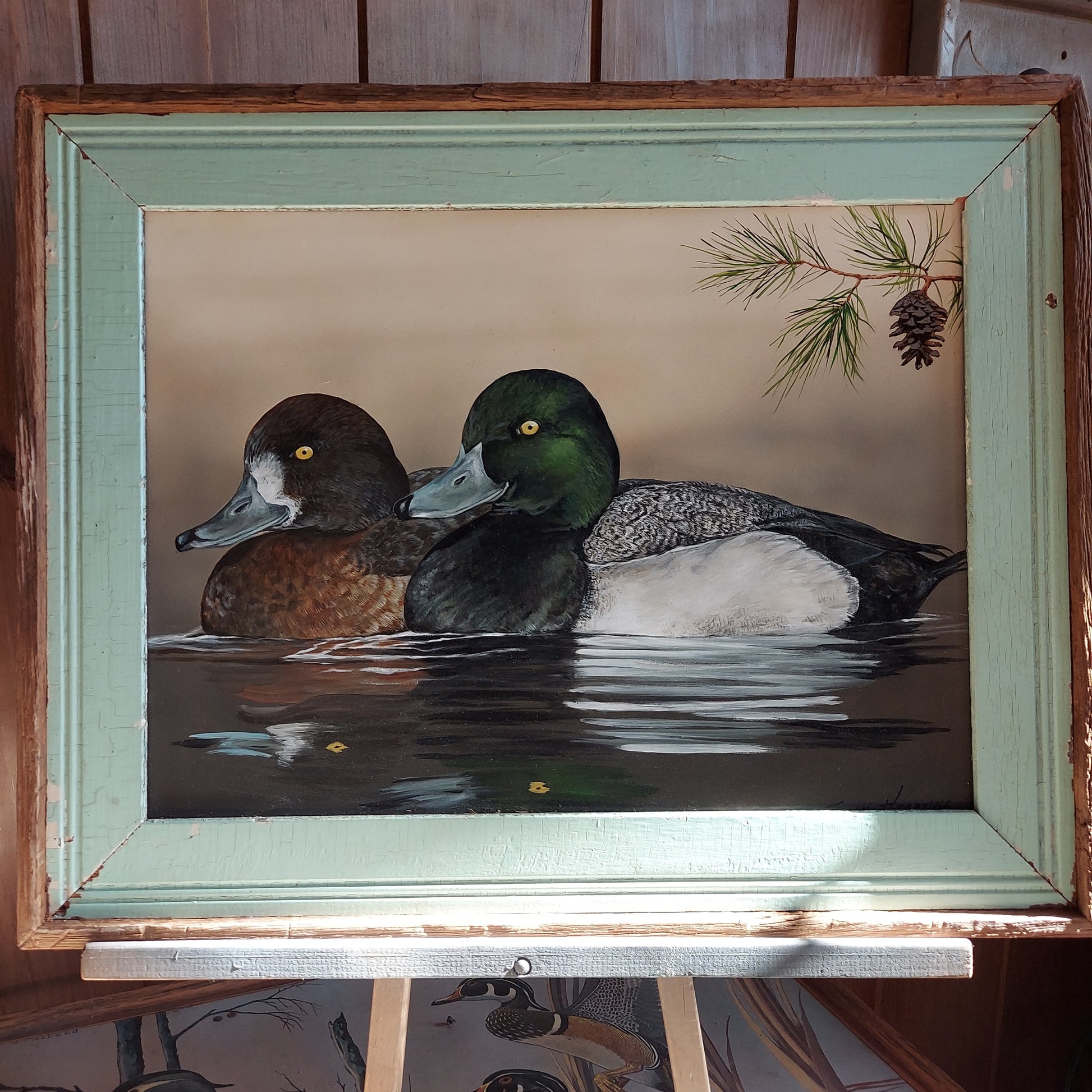 Painted by Rustic Duck wildlife artist Susan Hearting. Oil on Masonite. Framed in barn wood