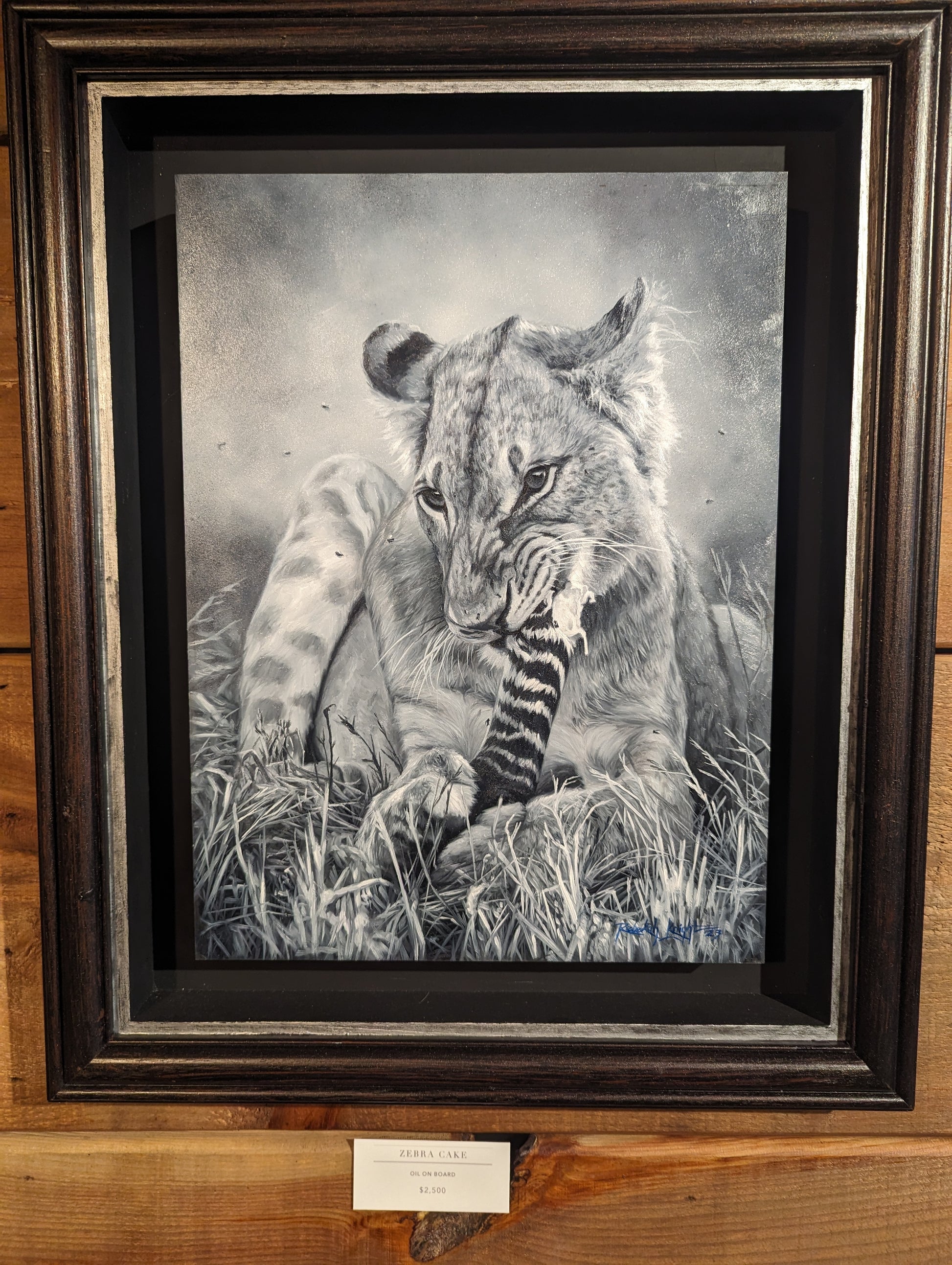 Zebra Cake is an oil on board. Painted by Wildlife Artist Rebekah Knight. Measures 22.5 x 19.